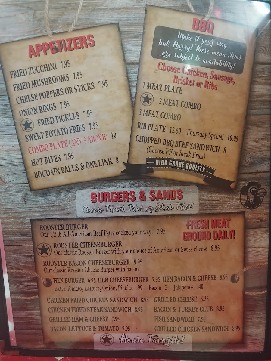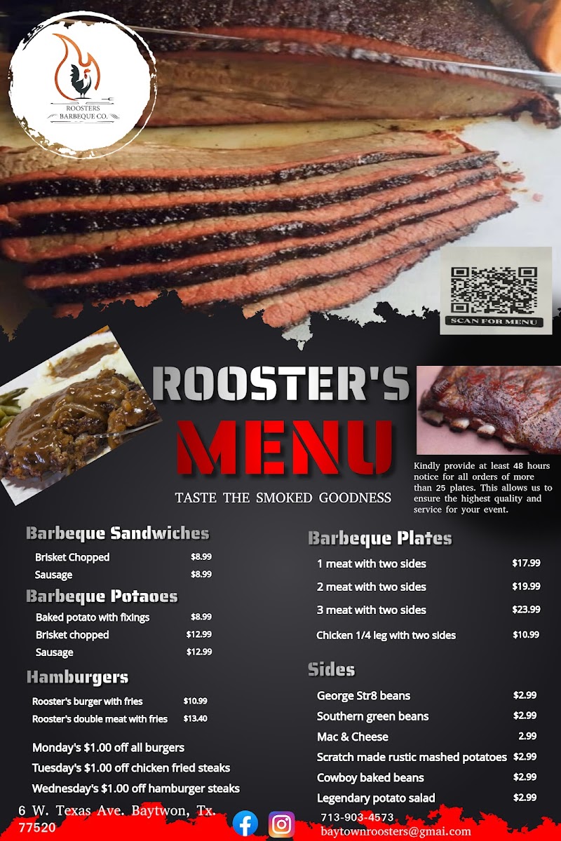 At Rooster's Barbeque Co. Menu, you'll find a delicious blend of smoky, savory, and mouthwatering flavors. Located at 6 W Texas Ave in Baytown, TX, this cozy spot serves up a selection of tender, slow-cooked meats, from perfectly seasoned ribs to juicy pulled pork. The menu is all about quality and comfort, offering everything from hearty sandwiches to flavorful sides like baked beans and creamy coleslaw. Whether you're here for a quick bite or a full meal with friends, every dish is made with care and packed with flavor. With a welcoming atmosphere and a menu that highlights the best of barbecue, there's always something to satisfy your cravings. So, whether you're a barbecue aficionado or just looking to try something new, Rooster's Barbeque Co. Menu offers a great meal every time.